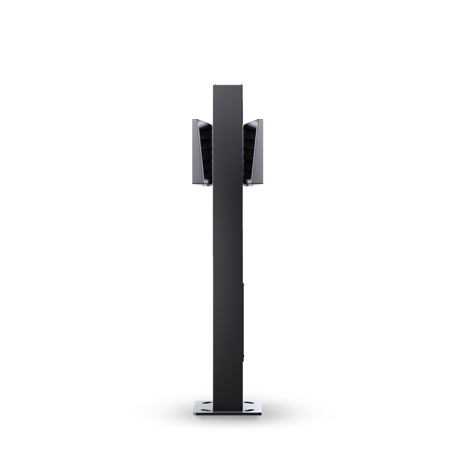 Stolpen är pulverlackerad och har ett svart frontlock som enkelt kan tas bort för att ge åtkomst till kopplingsboxen. Markmonteringen är smidig med fyra bultfästen i botten, anpassade för standardbasen CC160.